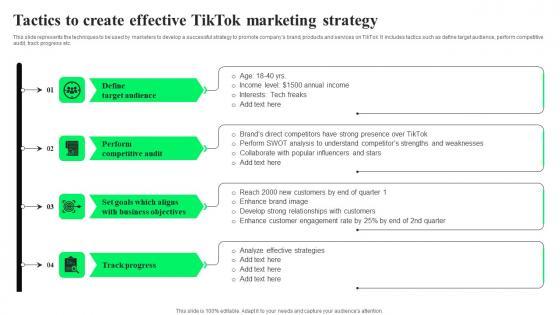 This slide represents the techniques to be used by marketers to develop a successful strategy to promote companys brand, products and services on TikTok. It includes tactics such as define target audience, perform competitive audit, track progress etc. Here you can discover an assortment of the finest PowerPoint and Google Slides templates. With these templates, you can create presentations for a variety of purposes while simultaneously providing your audience with an eye catching visual experience. Download Tactics To Create Effective TikTok Marketing TikTok Advertising Strategies To Provide Effective Structure Pdf to deliver an impeccable presentation. These templates will make your job of preparing presentations much quicker, yet still, maintain a high level of quality. Slidegeeks has experienced researchers who prepare these templates and write high quality content for you. Later on, you can personalize the content by editing the Tactics To Create Effective TikTok Marketing TikTok Advertising Strategies To Provide Effective Structure Pdf. This slide represents the techniques to be used by marketers to develop a successful strategy to promote companys brand, products and services on TikTok. It includes tactics such as define target audience, perform competitive audit, track progress etc.