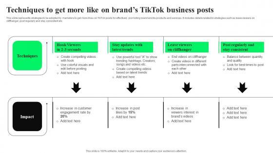 This slide represents strategies to be adopted by marketers to get more likes on TikTok posts for effectively promoting brand and its products and services. It includes details related to strategies such as leave viewers on cliffhanger, post regularly and stay consistent etc. Take your projects to the next level with our ultimate collection of Techniques To Get More Like On Business TikTok Advertising Strategies To Provide Effective Sample Pdf. Slidegeeks has designed a range of layouts that are perfect for representing task or activity duration, keeping track of all your deadlines at a glance. Tailor these designs to your exact needs and give them a truly corporate look with your own brand colors they will make your projects stand out from the rest This slide represents strategies to be adopted by marketers to get more likes on TikTok posts for effectively promoting brand and its products and services. It includes details related to strategies such as leave viewers on cliffhanger, post regularly and stay consistent etc.
