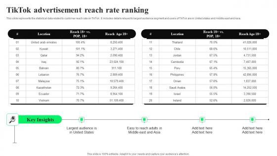 This slide represents the statistical data related to customer reach rate on tiktok. It includes details relayed to largest audience segment and users of tiktok are in united states and middle east and asia. Create an editable Tiktok Advertisement Reach Rate Ranking Background PDF that communicates your idea and engages your audience. Whether you are presenting a business or an educational presentation, pre designed presentation templates help save time. Tiktok Advertisement Reach Rate Ranking Background PDF is highly customizable and very easy to edit, covering many different styles from creative to business presentations. Slidegeeks has creative team members who have crafted amazing templates. So, go and get them without any delay.