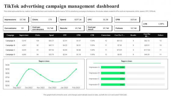 This slide represents the key metrics dashboard to track and monitor the performance TikTok advertising campaign of enterprise. It includes details related to KPIs such as impressions, clicks, spend, CPC, CPM etc. Create an editable TikTok Advertising Campaign Management TikTok Advertising Strategies To Provide Effective Demonstration Pdf that communicates your idea and engages your audience. Whether you are presenting a business or an educational presentation, pre designed presentation templates help save time. TikTok Advertising Campaign Management TikTok Advertising Strategies To Provide Effective Demonstration Pdf is highly customizable and very easy to edit, covering many different styles from creative to business presentations. Slidegeeks has creative team members who have crafted amazing templates. So, go and get them without any delay. This slide represents the key metrics dashboard to track and monitor the performance TikTok advertising campaign of enterprise. It includes details related to KPIs such as impressions, clicks, spend, CPC, CPM etc.