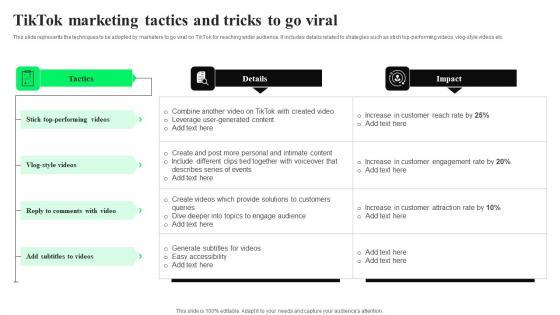 This slide represents the techniques to be adopted by marketers to go viral on TikTok for reaching wider audience. It includes details related to strategies such as stich top performing videos, vlog style videos etc. Are you in need of a template that can accommodate all of your creative concepts This one is crafted professionally and can be altered to fit any style. Use it with Google Slides or PowerPoint. Include striking photographs, symbols, depictions, and other visuals. Fill, move around, or remove text boxes as desired. Test out color palettes and font mixtures. Edit and save your work, or work with colleagues. Download TikTok Marketing Tactics And Tricks To Go TikTok Advertising Strategies To Provide Effective Download Pdf and observe how to make your presentation outstanding. Give an impeccable presentation to your group and make your presentation unforgettable. This slide represents the techniques to be adopted by marketers to go viral on TikTok for reaching wider audience. It includes details related to strategies such as stich top performing videos, vlog style videos etc.