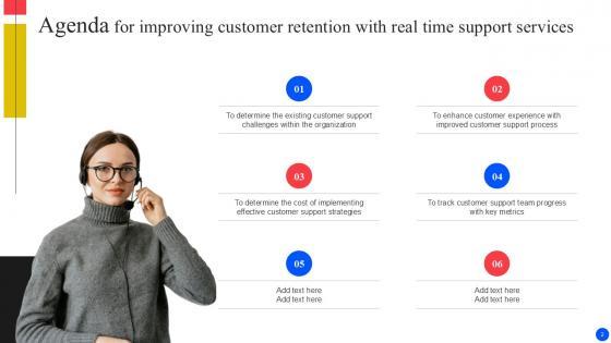 Boost your pitch with our creative Agenda For Improving Customer Retention With Real Time Support PPT Sample. Deliver an awe-inspiring pitch that will mesmerize everyone. Using these presentation templates you will surely catch everyones attention. You can browse the ppts collection on our website. We have researchers who are experts at creating the right content for the templates. So you do not have to invest time in any additional work. Just grab the template now and use them. Our Agenda For Improving Customer Retention With Real Time Support PPT Sample are topically designed to provide an attractive backdrop to any subject. Use them to look like a presentation pro.