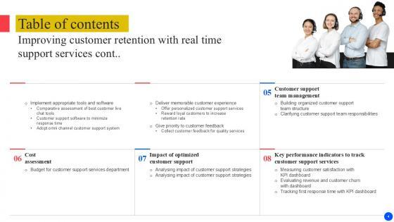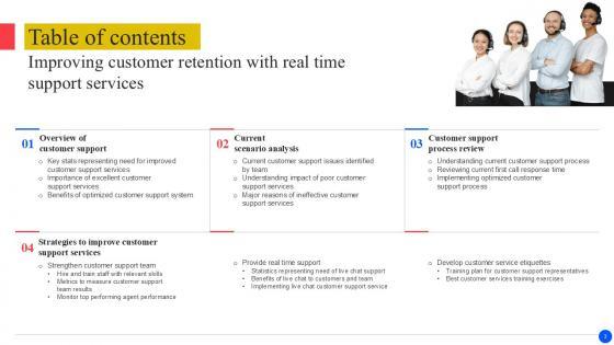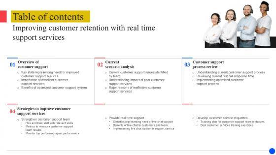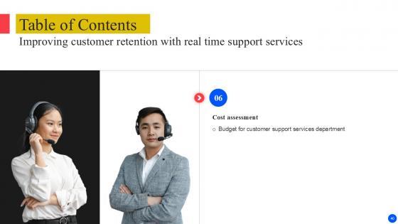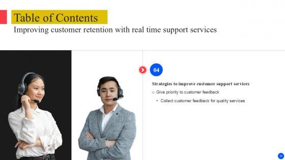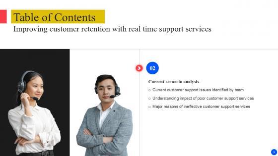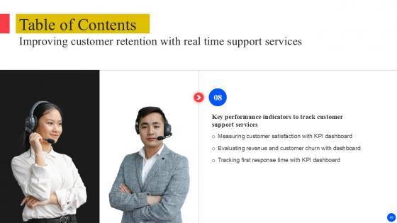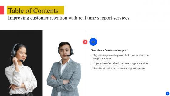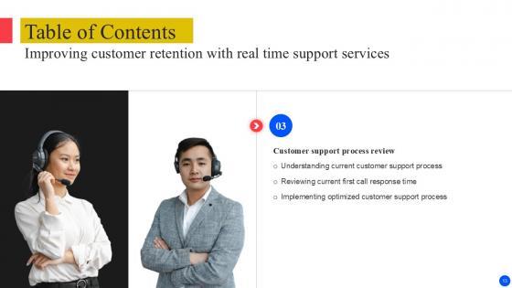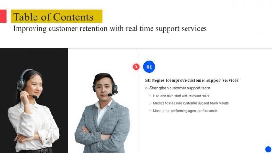 Retrieve professionally designed Table Of Content Improving Customer Retention With Real Time Support PPT Presentation to effectively convey your message and captivate your listeners. Save time by selecting pre-made slideshows that are appropriate for various topics, from business to educational purposes. These themes come in many different styles, from creative to corporate, and all of them are easily adjustable and can be edited quickly. Access them as PowerPoint templates or as Google Slides themes. You do not have to go on a hunt for the perfect presentation because Slidegeeks got you covered from everywhere. Our Table Of Content Improving Customer Retention With Real Time Support PPT Presentation are topically designed to provide an attractive backdrop to any subject. Use them to look like a presentation pro.