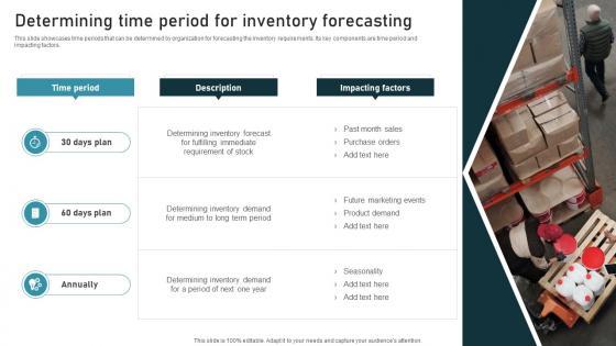 This slide showcases time periods that can be determined by organization for forecasting the inventory requirements. Its key components are time period and impacting factors. Formulating a presentation can take up a lot of effort and time, so the content and message should always be the primary focus. The visuals of the PowerPoint can enhance the presenters message, so our Determining Time Period For Inventory Forecasting Mockup PDF was created to help save time. Instead of worrying about the design, the presenter can concentrate on the message while our designers work on creating the ideal templates for whatever situation is needed. Slidegeeks has experts for everything from amazing designs to valuable content, we have put everything into Determining Time Period For Inventory Forecasting Mockup PDF.