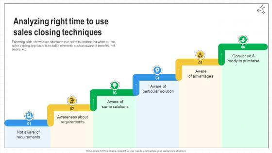 Following slide showcases situations that helps to understand when to use sales closing approach. It includes elements such as aware of benefits, not aware, etc. There are so many reasons you need a Closing Techniques To Seal Analyzing Right Time To Use Sales Closing Techniques SA SS V. The first reason is you can not spend time making everything from scratch, Thus, Slidegeeks has made presentation templates for you too. You can easily download these templates from our website easily. Following slide showcases situations that helps to understand when to use sales closing approach. It includes elements such as aware of benefits, not aware, etc.