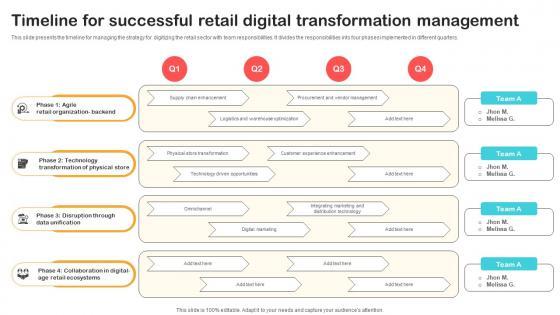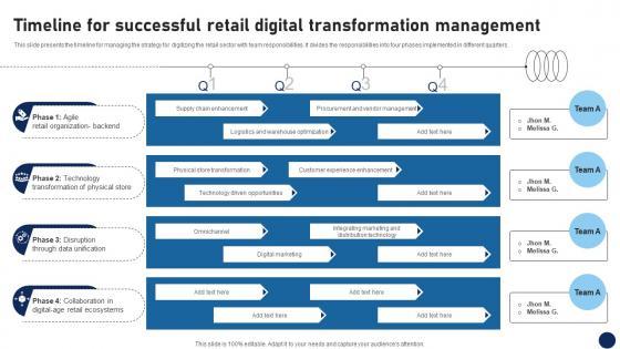 This slide presents the timeline for managing the strategy for digitizing the retail sector with team responsibilities. It divides the responsibilities into four phases implemented in different quarters.Boost your pitch with our creative Timeline For Successful Retail Digital Transformation Optimizing Retail Operations With Digital DT SS V. Deliver an awe-inspiring pitch that will mesmerize everyone. Using these presentation templates you will surely catch everyones attention. You can browse the ppts collection on our website. We have researchers who are experts at creating the right content for the templates. So you do not have to invest time in any additional work. Just grab the template now and use them. This slide presents the timeline for managing the strategy for digitizing the retail sector with team responsibilities. It divides the responsibilities into four phases implemented in different quarters.