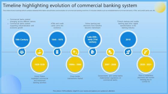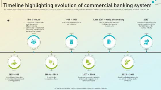 This slide shows roadmap which contains detailed information about history and evolution of commercial banking over time. It includes details such as establishment of commercial banks, ATMs and credit cards use, etc. Presenting this PowerPoint presentation, titled Timeline Highlighting Evolution Of Commercial Complete Guide On Managing Banking Fin SS V, with topics curated by our researchers after extensive research. This editable presentation is available for immediate download and provides attractive features when used. Download now and captivate your audience. Presenting this Timeline Highlighting Evolution Of Commercial Complete Guide On Managing Banking Fin SS V. Our researchers have carefully researched and created these slides with all aspects taken into consideration. This is a completely customizable Timeline Highlighting Evolution Of Commercial Complete Guide On Managing Banking Fin SS V that is available for immediate downloading. Download now and make an impact on your audience. Highlight the attractive features available with our PPTs. This slide shows roadmap which contains detailed information about history and evolution of commercial banking over time. It includes details such as establishment of commercial banks, ATMs and credit cards use, etc.