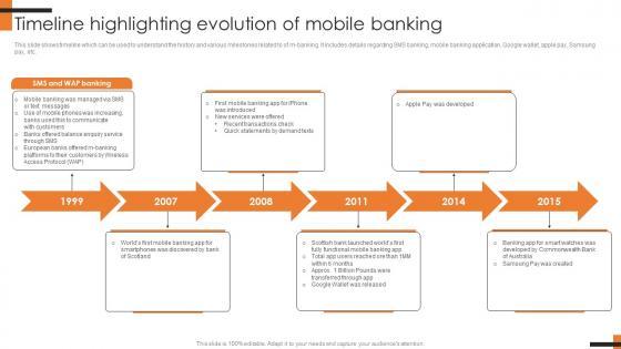 This slide shows timeline which can be used to understand the history and various milestones related to of m-banking. It includes details regarding SMS banking, mobile banking application, Google wallet, apple pay, Samsung pay, etc. Explore a selection of the finest Timeline Highlighting Evolution Of Mobile Comprehensive Smartphone Banking Mockup Pdf here. With a plethora of professionally designed and pre-made slide templates, you can quickly and easily find the right one for your upcoming presentation. You can use our Timeline Highlighting Evolution Of Mobile Comprehensive Smartphone Banking Mockup Pdf to effectively convey your message to a wider audience. Slidegeeks has done a lot of research before preparing these presentation templates. The content can be personalized and the slides are highly editable. Grab templates today from Slidegeeks. This slide shows timeline which can be used to understand the history and various milestones related to of m banking. It includes details regarding SMS banking, mobile banking application, Google wallet, apple pay, Samsung pay, etc.