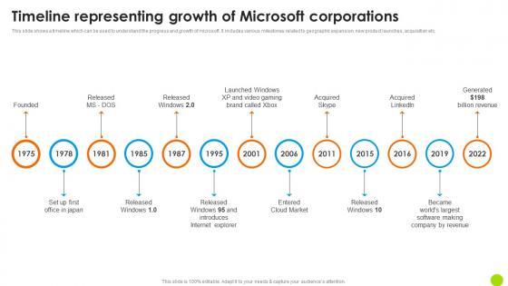 This slide shows a timeline which can be used to understand the progress and growth of microsoft. It includes various milestones related to geographic expansion, new product launches, acquisition etc. Here you can discover an assortment of the finest PowerPoint and Google Slides templates. With these templates, you can create presentations for a variety of purposes while simultaneously providing your audience with an eye-catching visual experience. Download Microsoft Strategic Plan To Become Market Leader Timeline Representing Growth Of Microsoft Corporations Professional PDF to deliver an impeccable presentation. These templates will make your job of preparing presentations much quicker, yet still, maintain a high level of quality. Slidegeeks has experienced researchers who prepare these templates and write high-quality content for you. Later on, you can personalize the content by editing the Microsoft Strategic Plan To Become Market Leader Timeline Representing Growth Of Microsoft Corporations Professional PDF.