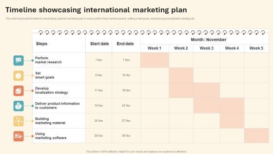This slide represents timeline for developing a global marketing plan. It covers performing market research, setting smart goals, developing personalization strategy etc.There are so many reasons you need a Timeline Showcasing International Marketing International Marketing Strategy Template Pdf. The first reason is you can not spend time making everything from scratch, Thus, Slidegeeks has made presentation templates for you too. You can easily download these templates from our website easily. This slide represents timeline for developing a global marketing plan. It covers performing market research, setting smart goals, developing personalization strategy etc.