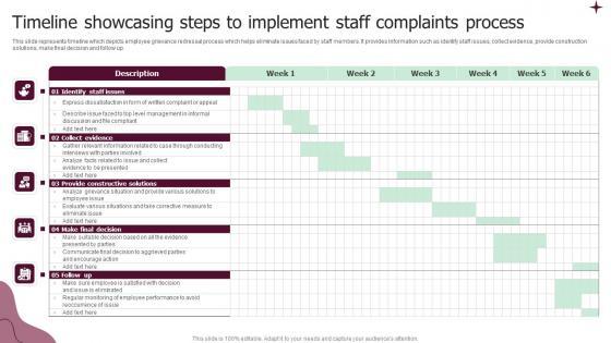 This slide represents timeline which depicts employee grievance redressal process which helps eliminate issues faced by staff members. It provides information such as identify staff issues, collect evidence, provide construction solutions, make final decision and follow up. Pitch your topic with ease and precision using this Timeline Showcasing Steps To Implement Staff Complaints Process Summary Pdf. This layout presents information on Complaints Process, Timeline, Steps. It is also available for immediate download and adjustment. So, changes can be made in the color, design, graphics or any other component to create a unique layout. This slide represents timeline which depicts employee grievance redressal process which helps eliminate issues faced by staff members. It provides information such as identify staff issues, collect evidence, provide construction solutions, make final decision and follow up.