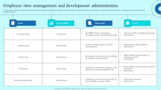 This slide presents time management action plan for employees in organisation, helpful in maintaining higher productivity and balanced lifestyle. It includes setting correct goals. Prioritizing wisely, setting time limit and taking breaks Pitch your topic with ease and precision using this Employee Time Management And Development Administration Background Pdf This layout presents information on Responsibility, Action Plan, Goals It is also available for immediate download and adjustment. So, changes can be made in the color, design, graphics or any other component to create a unique layout. This slide presents time management action plan for employees in organisation, helpful in maintaining higher productivity and balanced lifestyle. It includes setting correct goals. Prioritizing wisely, setting time limit and taking breaks