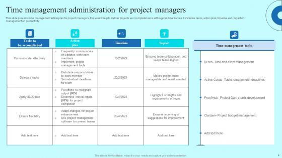 This slide presents time management action plan for project managers, that would help to deliver projects and complete tasks within given time frames. It includes tasks, action plan, timeline and impact of management on productivity Pitch your topic with ease and precision using this Time Management Administration For Project Managers Rules Pdf This layout presents information on Communicate Effectively, Action Plan, Timeline It is also available for immediate download and adjustment. So, changes can be made in the color, design, graphics or any other component to create a unique layout. This slide presents time management action plan for project managers, that would help to deliver projects and complete tasks within given time frames. It includes tasks, action plan, timeline and impact of management on productivity
