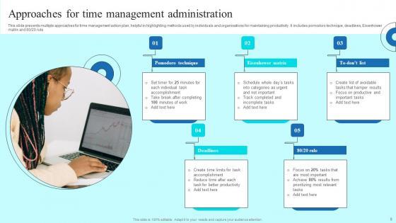 This slide presents multiple approaches for time management action plan, helpful in highlighting methods used by individuals and organisations for maintaining productivity. It includes pomodoro technique, deadlines, Eisenhower matrix and 80 20 rule Showcasing this set of slides titled Approaches For Time Management Administration Clipart Pdf The topics addressed in these templates are Pomodoro Technique, Eisenhower Matrix, Deadlines All the content presented in this PPT design is completely editable. Download it and make adjustments in color, background, font etc. as per your unique business setting. This slide presents multiple approaches for time management action plan, helpful in highlighting methods used by individuals and organisations for maintaining productivity. It includes pomodoro technique, deadlines, Eisenhower matrix and 80 20 rule