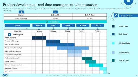 This slide presents product development and time management action plan, that would help to rule out various activities in strategic time bound manner. It includes activities, responsibility distribution and timeline for tasks management Pitch your topic with ease and precision using this Product Development And Time Management Administration Professional Pdf This layout presents information on Develop Prototype, Potential Market, Produce Initial Channel It is also available for immediate download and adjustment. So, changes can be made in the color, design, graphics or any other component to create a unique layout. This slide presents product development and time management action plan, that would help to rule out various activities in strategic time bound manner. It includes activities, responsibility distribution and timeline for tasks management