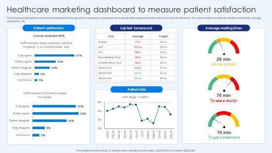 The following slide outlines comprehensive dashboard through which medical care companies can evaluate patient experience and make more informed decisions. The metrics outlined in slide are lab test, patient falls, average waiting time, etc. Crafting an eye-catching presentation has never been more straightforward. Let your presentation shine with this tasteful yet straightforward Healthcare Marketing Dashboard To Measure Patient Healthcare Promotion Download Pdf template. It offers a minimalistic and classy look that is great for making a statement. The colors have been employed intelligently to add a bit of playfulness while still remaining professional. Construct the ideal Healthcare Marketing Dashboard To Measure Patient Healthcare Promotion Download Pdf that effortlessly grabs the attention of your audience Begin now and be certain to wow your customers The following slide outlines comprehensive dashboard through which medical care companies can evaluate patient experience and make more informed decisions. The metrics outlined in slide are lab test, patient falls, average waiting time, etc.