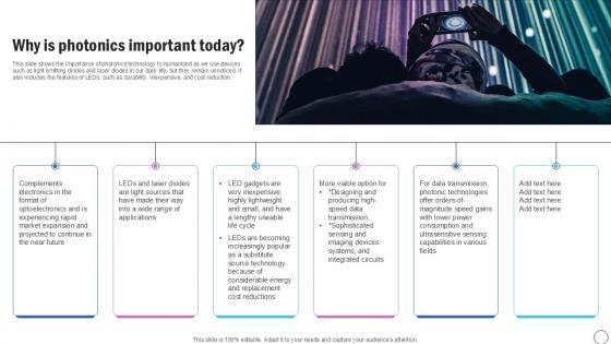 This slide shows the importance of photonics technology to humankind as we use devices such as light emitting diodes and laser diodes in our daily life, but they remain unnoticed. It also includes the features of LEDs, such as durability, inexpensive, and cost reduction.The best PPT templates are a great way to save time, energy, and resources. Slidegeeks have 100 percent editable powerpoint slides making them incredibly versatile. With these quality presentation templates, you can create a captivating and memorable presentation by combining visually appealing slides and effectively communicating your message. Download Why Is Photonics Important Today Silicon Photonics SiPh It Ppt Example from Slidegeeks and deliver a wonderful presentation. This slide shows the importance of photonics technology to humankind as we use devices such as light emitting diodes and laser diodes in our daily life, but they remain unnoticed. It also includes the features of LEDs, such as durability, inexpensive, and cost reduction.