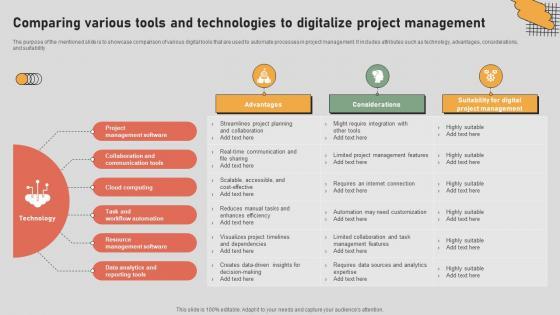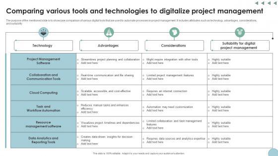 The purpose of the mentioned slide is to showcase comparison of various digital tools that are used to automate processes in project management. It includes attributes such as technology, advantages, considerations, and suitability. Do you have to make sure that everyone on your team knows about any specific topic I yes, then you should give Digital Project Management Strategies Comparing Various Tools And Technologies To Digitalize a try. Our experts have put a lot of knowledge and effort into creating this impeccable Digital Project Management Strategies Comparing Various Tools And Technologies To Digitalize. You can use this template for your upcoming presentations, as the slides are perfect to represent even the tiniest detail. You can download these templates from the Slidegeeks website and these are easy to edit. So grab these today The purpose of the mentioned slide is to showcase comparison of various digital tools that are used to automate processes in project management. It includes attributes such as technology, advantages, considerations, and suitability.