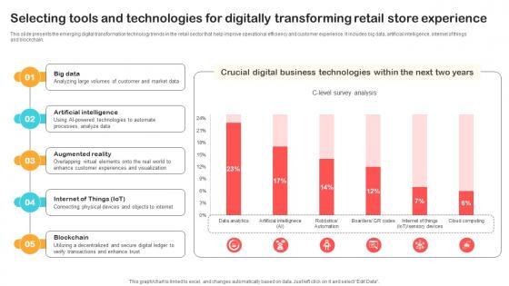 This slide presents the emerging digital transformation technology trends in the retail sector that help improve operational efficiency and customer experience. It includes big data, artificial intelligence, internet of things and blockchain.The Selecting Tools And Technologies For Digitally Transforming Retail Store Experience is a compilation of the most recent design trends as a series of slides. It is suitable for any subject or industry presentation, containing attractive visuals and photo spots for businesses to clearly express their messages. This template contains a variety of slides for the user to input data, such as structures to contrast two elements, bullet points, and slides for written information. Slidegeeks is prepared to create an impression. This slide presents the emerging digital transformation technology trends in the retail sector that help improve operational efficiency and customer experience. It includes big data, artificial intelligence, internet of things and blockchain.