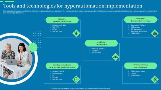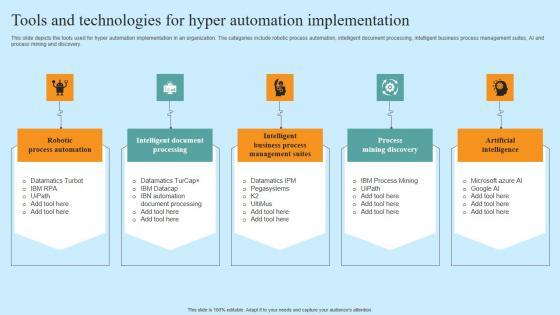 This slide depicts the tools used for hyper automation implementation in an organization. The categories include robotic process automation, intelligent document processing, intelligent business process management suites, AI and process mining and discovery. Slidegeeks has constructed Role Of Hyperautomation In Redefining Business Tools And Technologies For Hyper Automation Themes PDF after conducting extensive research and examination. These presentation templates are constantly being generated and modified based on user preferences and critiques from editors. Here, you will find the most attractive templates for a range of purposes while taking into account ratings and remarks from users regarding the content. This is an excellent jumping off point to explore our content and will give new users an insight into our top notch PowerPoint Templates.