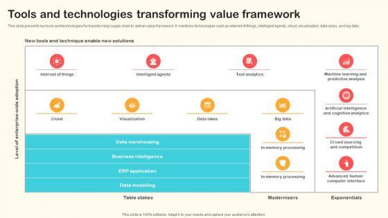 This slide presents key tools and technologies for transforming supply chain to deliver value framework. It mentions technologies such as internet of things, intelligent agents, cloud, visualisation, data lakes, and big data.Slidegeeks is one of the best resources for PowerPoint templates. You can download easily and regulate Tools And Technologies Transforming Value Framework DT SS V for your personal presentations from our wonderful collection. A few clicks is all it takes to discover and get the most relevant and appropriate templates. Use our Templates to add a unique zing and appeal to your presentation and meetings. All the slides are easy to edit and you can use them even for advertisement purposes. This slide presents key tools and technologies for transforming supply chain to deliver value framework. It mentions technologies such as internet of things, intelligent agents, cloud, visualisation, data lakes, and big data.