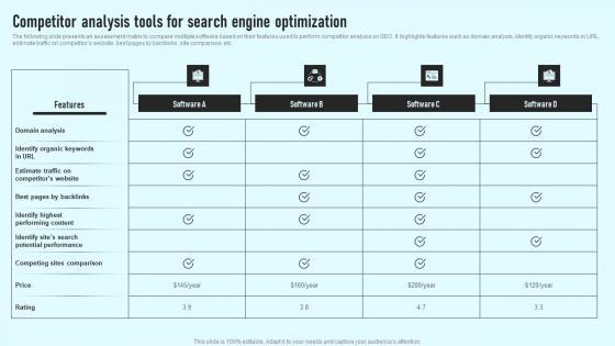 The following slide presents an assessment matrix to compare multiple software based on their features used to perform competitor analysis on SEO. It highlights features such as domain analysis, identify organic keywords in URL, estimate traffic on competitors website, best pages by backlinks, site comparison, etc. Make sure to capture your audiences attention in your business displays with our gratis customizable Competitor Analysis Tools For Search Engine Optimization Comprehensive Guide Formats Pdf These are great for business strategies, office conferences, capital raising or task suggestions. If you desire to acquire more customers for your tech business and ensure they stay satisfied, create your own sales presentation with these plain slides. The following slide presents an assessment matrix to compare multiple software based on their features used to perform competitor analysis on SEO. It highlights features such as domain analysis, identify organic keywords in URL, estimate traffic on competitors website, best pages by backlinks, site comparison, etc.