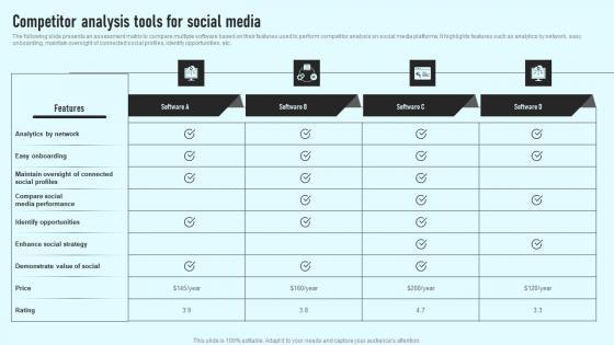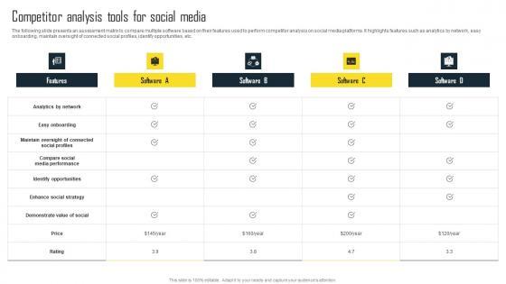 The following slide presents an assessment matrix to compare multiple software based on their features used to perform competitor analysis on social media platforms. It highlights features such as analytics by network, easy onboarding, maintain oversight of connected social profiles, identify opportunities, etc. From laying roadmaps to briefing everything in detail, our templates are perfect for you. You can set the stage with your presentation slides. All you have to do is download these easy-to-edit and customizable templates. Steps To Conduct Competitor Analysis Competitor Analysis Tools For Social Media Slides PDF will help you deliver an outstanding performance that everyone would remember and praise you for. Do download this presentation today.
