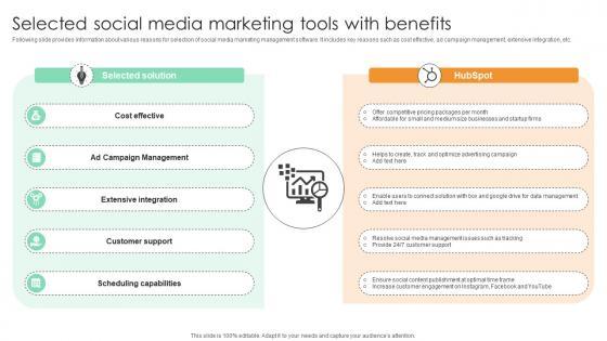 Following slide provides information about various reasons for selection of social media marketing management software. It includes key reasons such as cost effective, ad campaign management, extensive integration, etc.Find a pre-designed and impeccable Selected Social Media Marketing Tools With Benefits Comprehensive Guide For Marketing Technology. The templates can ace your presentation without additional effort. You can download these easy-to-edit presentation templates to make your presentation stand out from others. So, what are you waiting for Download the template from Slidegeeks today and give a unique touch to your presentation. Following slide provides information about various reasons for selection of social media marketing management software. It includes key reasons such as cost effective, ad campaign management, extensive integration, etc.