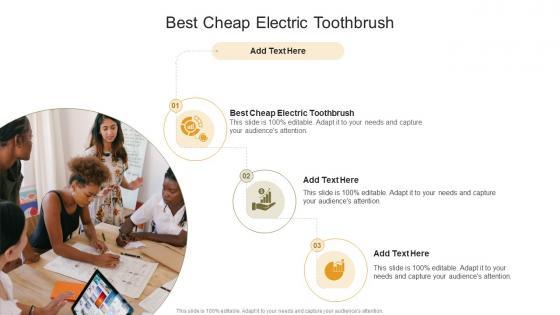 Introducing our well designed Best Cheap Electric Toothbrush In Powerpoint And Google Slides Cpb. This PowerPoint design presents information on topics like Best Cheap Electric Toothbrush. As it is predesigned it helps boost your confidence level. It also makes you a better presenter because of its high quality content and graphics. This PPT layout can be downloaded and used in different formats like PDF, PNG, and JPG. Not only this, it is available in both Standard Screen and Widescreen aspect ratios for your convenience. Therefore, click on the download button now to persuade and impress your audience. Our Best Cheap Electric Toothbrush In Powerpoint And Google Slides Cpb are topically designed to provide an attractive backdrop to any subject. Use them to look like a presentation pro.