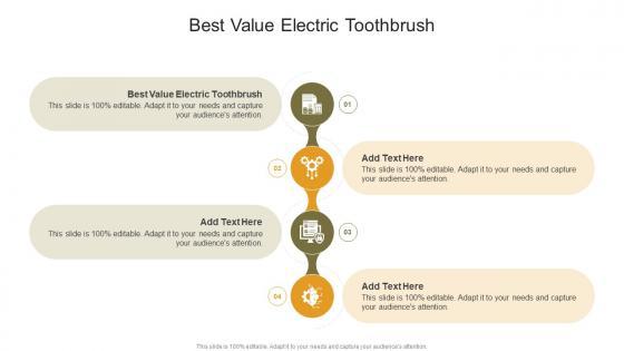 Introducing our well designed Best Value Electric Toothbrush In Powerpoint And Google Slides Cpb. This PowerPoint design presents information on topics like Best Value Electric Toothbrush. As it is predesigned it helps boost your confidence level. It also makes you a better presenter because of its high quality content and graphics. This PPT layout can be downloaded and used in different formats like PDF, PNG, and JPG. Not only this, it is available in both Standard Screen and Widescreen aspect ratios for your convenience. Therefore, click on the download button now to persuade and impress your audience. Our Best Value Electric Toothbrush In Powerpoint And Google Slides Cpb are topically designed to provide an attractive backdrop to any subject. Use them to look like a presentation pro.