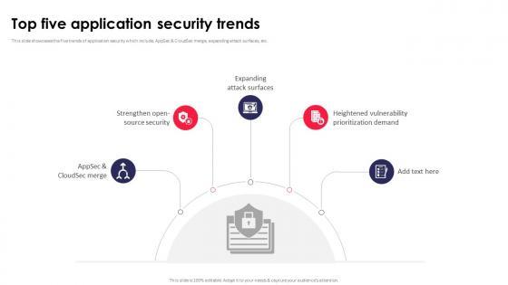 This slide showcases the five trends of application security which include, AppSec and CloudSec merge, expanding attack surfaces, etc. Slidegeeks has constructed Top Five Application Security Trends Application Security Testing after conducting extensive research and examination. These presentation templates are constantly being generated and modified based on user preferences and critiques from editors. Here, you will find the most attractive templates for a range of purposes while taking into account ratings and remarks from users regarding the content. This is an excellent jumping-off point to explore our content and will give new users an insight into our top-notch PowerPoint Templates. This slide showcases the five trends of application security which include, AppSec and CloudSec merge, expanding attack surfaces, etc.