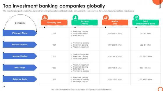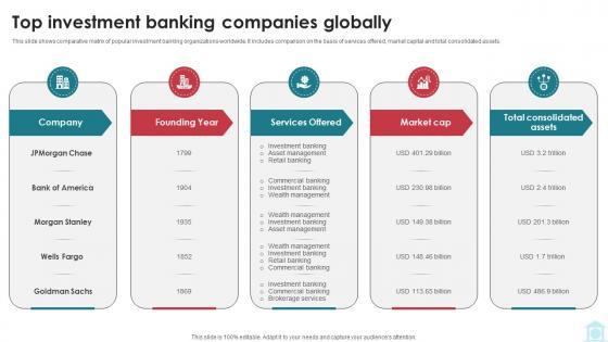 This slide shows comparative matrix of popular investment banking organizations worldwide. It includes comparison on the basis of services offered, market capital and total consolidated assets. Explore a selection of the finest Top Investment Banking Companies Globally Understanding Investment Banking Framework Fin SS V here. With a plethora of professionally designed and pre-made slide templates, you can quickly and easily find the right one for your upcoming presentation. You can use our Top Investment Banking Companies Globally Understanding Investment Banking Framework Fin SS V to effectively convey your message to a wider audience. Slidegeeks has done a lot of research before preparing these presentation templates. The content can be personalized and the slides are highly editable. Grab templates today from Slidegeeks. This slide shows comparative matrix of popular investment banking organizations worldwide. It includes comparison on the basis of services offered, market capital and total consolidated assets.