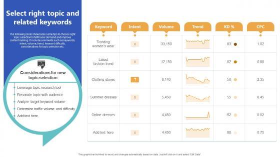 The following slide showcases some tips to choose right topic selection to fulfill user demand and improve content ranking. It includes elements such as keywords, intent, volume, trend, keyword difficulty, considerations for topic selection etc. Explore a selection of the finest Select Right Topic And Related Keywords Top Of The Funnel Digital Content Strategy SS V here. With a plethora of professionally designed and pre-made slide templates, you can quickly and easily find the right one for your upcoming presentation. You can use our Select Right Topic And Related Keywords Top Of The Funnel Digital Content Strategy SS V to effectively convey your message to a wider audience. Slidegeeks has done a lot of research before preparing these presentation templates. The content can be personalized and the slides are highly editable. Grab templates today from Slidegeeks. The following slide showcases some tips to choose right topic selection to fulfill user demand and improve content ranking. It includes elements such as keywords, intent, volume, trend, keyword difficulty, considerations for topic selection etc.