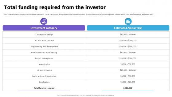 This slide represents the various investment categories. These are concept design, asset creation, development, quality assurance, project management, monetization, user interface design, and many more. This Total Funding Required From The Investor Video Game Financing Pitch Deck is perfect for any presentation, be it in front of clients or colleagues. It is a versatile and stylish solution for organizing your meetings. The Total Funding Required From The Investor Video Game Financing Pitch Deck features a modern design for your presentation meetings. The adjustable and customizable slides provide unlimited possibilities for acing up your presentation. Slidegeeks has done all the homework before launching the product for you. So, do not wait, grab the presentation templates today This slide represents the various investment categories. These are concept design, asset creation, development, quality assurance, project management, monetization, user interface design, and many more.