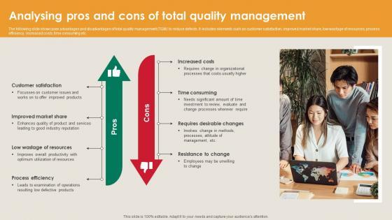 The following slide showcases advantages and disadvantages of total quality management TQM to reduce defects. It includes elements such as customer satisfaction, improved market share, low wastage of resources, process efficiency, increased costs, time consuming etc. Want to ace your presentation in front of a live audience Our Analysing Pros And Cons Of Total Quality Manufacturing Strategy Driving Industry 4 0 can help you do that by engaging all the users towards you. Slidegeeks experts have put their efforts and expertise into creating these impeccable powerpoint presentations so that you can communicate your ideas clearly. Moreover, all the templates are customizable, and easy-to-edit and downloadable. Use these for both personal and commercial use. The following slide showcases advantages and disadvantages of total quality management TQM to reduce defects. It includes elements such as customer satisfaction, improved market share, low wastage of resources, process efficiency, increased costs, time consuming etc.