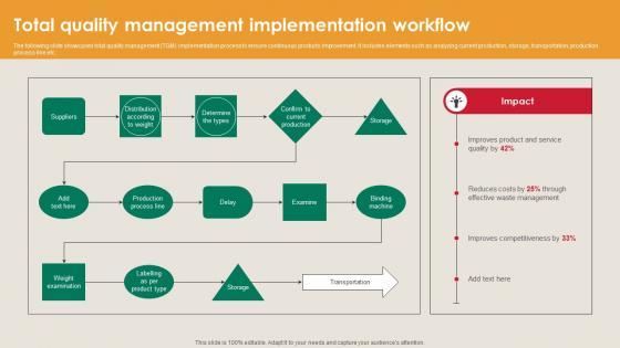 The following slide showcases total quality management TQM implementation process to ensure continuous products improvement. It includes elements such as analyzing current production, storage, transportation, production process line etc. Welcome to our selection of the Total Quality Management Implementation Manufacturing Strategy Driving Industry 4 0. These are designed to help you showcase your creativity and bring your sphere to life. Planning and Innovation are essential for any business that is just starting out. This collection contains the designs that you need for your everyday presentations. All of our PowerPoints are 100Percent editable, so you can customize them to suit your needs. This multi-purpose template can be used in various situations. Grab these presentation templates today. The following slide showcases total quality management TQM implementation process to ensure continuous products improvement. It includes elements such as analyzing current production, storage, transportation, production process line etc.