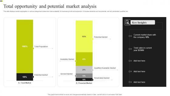 This slide displays market segregation in various categories to determine total availability for business growth and expansion. It includes elements such as potential, served, penetrated, qualified, etc. Showcasing this set of slides titled Total Opportunity And Potential Market Analysis Brochure Pdf. The topics addressed in these templates are Total Opportunity, Potential Market Analysis, Business Growth And Expansion. All the content presented in this PPT design is completely editable. Download it and make adjustments in color, background, font etc. as per your unique business setting. This slide displays market segregation in various categories to determine total availability for business growth and expansion. It includes elements such as potential, served, penetrated, qualified, etc.