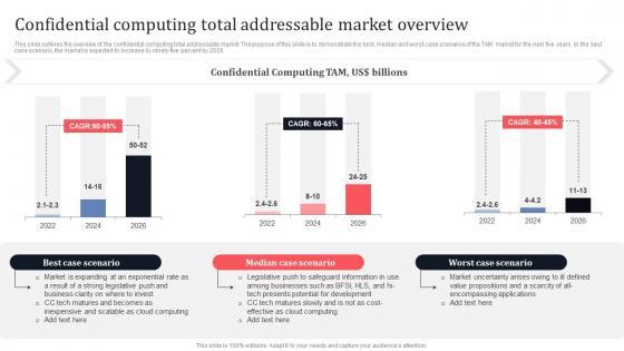 This slide outlines the overview of the confidential computing total addressable market. The purpose of this slide is to demonstrate the best, median and worst-case scenarios of the TAM market for the next five years. In the best case scenario, the market is expected to increase by ninety-five percent by 2026. Welcome to our selection of the Confidential Computing Total Addressable Market Overview Secure Multi Party Download Pdf These are designed to help you showcase your creativity and bring your sphere to life. Planning and Innovation are essential for any business that is just starting out. This collection contains the designs that you need for your everyday presentations. All of our PowerPoints are 100 percent editable, so you can customize them to suit your needs. This multi-purpose template can be used in various situations. Grab these presentation templates today. This slide outlines the overview of the confidential computing total addressable market. The purpose of this slide is to demonstrate the best, median and worst-case scenarios of the TAM market for the next five years. In the best case scenario, the market is expected to increase by ninety-five percent by 2026.