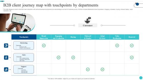 This slide displays a chart to track b2b client interaction with various business touchpoints to provide strategic overview of customer journey. It further includes details about brand impression, engaging, evaluation, buying, onboard, deploy, value realization, etc. Showcasing this set of slides titled B2B Client Journey Map With Touchpoints By Departments Summary Pdf. The topics addressed in these templates are Marketing, Client Interaction, Business Touchpoints, Value Realization. All the content presented in this PPT design is completely editable. Download it and make adjustments in color, background, font etc. as per your unique business setting. This slide displays a chart to track b2b client interaction with various business touchpoints to provide strategic overview of customer journey. It further includes details about brand impression, engaging, evaluation, buying, onboard, deploy, value realization, etc.