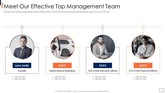 This slide shows the top management team details of ABC Company. It covers Founder details and other executives details such as COO, CEO, CFO, etc. Presenting travel and tour company fundraising pitch deck meet our effective top management structure pdf to provide visual cues and insights. Share and navigate important information on four stages that need your due attention. This template can be used to pitch topics like founder, global head of marketing, chief executive officer, chief financial officer. In addtion, this PPT design contains high resolution images, graphics, etc, that are easily editable and available for immediate download.