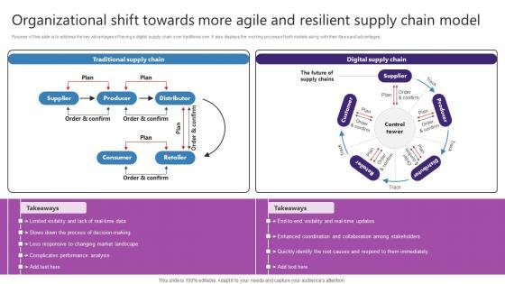 Purpose of this slide is to address the key advantages of having a digital supply chain over traditional one. It also displays the working process of both models along with their flaws and advantages. Take your projects to the next level with our ultimate collection of Organizational Shift Towards More Agile And Resilient Strategic Plan For Enhancing Inspiration Pdf Slidegeeks has designed a range of layouts that are perfect for representing task or activity duration, keeping track of all your deadlines at a glance. Tailor these designs to your exact needs and give them a truly corporate look with your own brand colors they well make your projects stand out from the rest. Purpose of this slide is to address the key advantages of having a digital supply chain over traditional one. It also displays the working process of both models along with their flaws and advantages.
