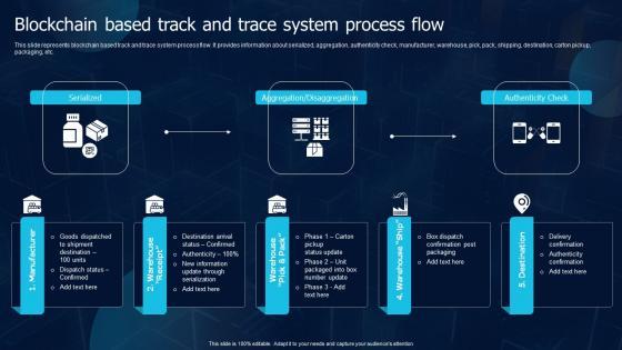 This slide represents blockchain based track and trace system process flow. It provides information about serialized, aggregation, authenticity check, manufacturer, warehouse, pick, pack, shipping, destination, carton pickup, packaging, etc. Slidegeeks is here to make your presentations a breeze with Blockchain Based Track And Trace System Process Flow Blockchain Transportation Slides Pdf With our easy to use and customizable templates, you can focus on delivering your ideas rather than worrying about formatting. With a variety of designs to choose from, you are sure to find one that suits your needs. And with animations and unique photos, illustrations, and fonts, you can make your presentation pop. So whether you are giving a sales pitch or presenting to the board, make sure to check out Slidegeeks first This slide represents blockchain based track and trace system process flow. It provides information about serialized, aggregation, authenticity check, manufacturer, warehouse, pick, pack, shipping, destination, carton pickup, packaging, etc.