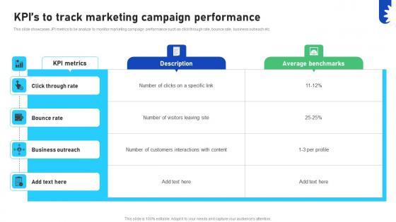 This slide showcases JPI metrics to be analyze to monitor marketing campaign performance such as click through rate, bounce rate, business outreach etc. Here you can discover an assortment of the finest PowerPoint and Google Slides templates. With these templates, you can create presentations for a variety of purposes while simultaneously providing your audience with an eye-catching visual experience. Download Improving Business Marketing Performance Kpis To Track Marketing Campaign CRP DK SS V to deliver an impeccable presentation. These templates will make your job of preparing presentations much quicker, yet still, maintain a high level of quality. Slidegeeks has experienced researchers who prepare these templates and write high-quality content for you. Later on, you can personalize the content by editing the Improving Business Marketing Performance Kpis To Track Marketing Campaign CRP DK SS V. This slide showcases JPI metrics to be analyze to monitor marketing campaign performance such as click through rate, bounce rate, business outreach etc.