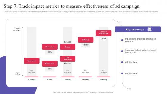 This slide provides an overview of impact metrics used to determine the success of campaign. The metrics covered are impressions, bounce rate, conversions, gross profit, active users, referrals, and customer lifetime value. Find highly impressive Step 7 Track Impact Metrics To Measure Effectiveness Of Ad Campaign Mockup PDF on Slidegeeks to deliver a meaningful presentation. You can save an ample amount of time using these presentation templates. No need to worry to prepare everything from scratch because Slidegeeks experts have already done a huge research and work for you. You need to download Step 7 Track Impact Metrics To Measure Effectiveness Of Ad Campaign Mockup PDF for your upcoming presentation. All the presentation templates are 100 percent editable and you can change the color and personalize the content accordingly. Download now.