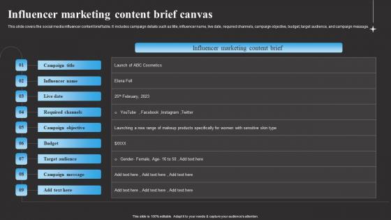 This slide covers the social media influencer content brief table. It includes campaign details such as title, influencer name, live date, required channels, campaign objective, budget, target audience, and campaign message. Crafting an eye-catching presentation has never been more straightforward. Let your presentation shine with this tasteful yet straightforward Influencer Marketing Content Brief Canvas Tracking Word Mouth Marketing Portrait PDF template. It offers a minimalistic and classy look that is great for making a statement. The colors have been employed intelligently to add a bit of playfulness while still remaining professional. Construct the ideal Influencer Marketing Content Brief Canvas Tracking Word Mouth Marketing Portrait PDF that effortlessly grabs the attention of your audience Begin now and be certain to wow your customers This slide covers the social media influencer content brief table. It includes campaign details such as title, influencer name, live date, required channels, campaign objective, budget, target audience, and campaign message.