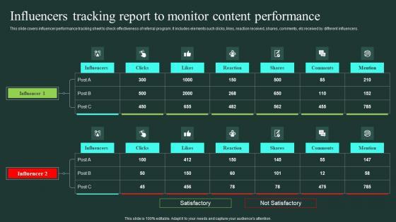 This slide covers influencer performance tracking sheet to check effectiveness of referral program. It includes elements such clicks, likes, reaction received, shares, comments, etc received by different influencers.Coming up with a presentation necessitates that the majority of the effort goes into the content and the message you intend to convey. The visuals of a PowerPoint presentation can only be effective if it supplements and supports the story that is being told. Keeping this in mind our experts created Influencers Tracking Report To Monitor Content Word Of Mouth Marketing Structure Pdf to reduce the time that goes into designing the presentation. This way, you can concentrate on the message while our designers take care of providing you with the right template for the situation. This slide covers influencer performance tracking sheet to check effectiveness of referral program. It includes elements such clicks, likes, reaction received, shares, comments, etc received by different influencers.