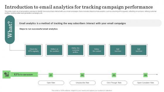 This slide covers an email analytics overview to identify how subscribers interact with your email campaigns. It also includes steps to email analytics, such as checking KPIs regularly, reflecting on numbers, refining customer profiles, building better lead generation campaigns, etc. Make sure to capture your audiences attention in your business displays with our gratis customizable Introduction Email Analytics Tracking Major Promotional Analytics Future Trends Introduction Pdf. These are great for business strategies, office conferences, capital raising or task suggestions. If you desire to acquire more customers for your tech business and ensure they stay satisfied, create your own sales presentation with these plain slides. This slide covers an email analytics overview to identify how subscribers interact with your email campaigns. It also includes steps to email analytics, such as checking KPIs regularly, reflecting on numbers, refining customer profiles, building better lead generation campaigns, etc.