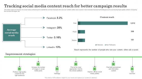 This slide covers an overview of social media content reach to identify the number of people who see your content, either ads or posts. It also includes improvement strategies such as producing high quality content, increasing the number of images, etc. Create an editable Tracking Social Media Content Major Promotional Analytics Future Trends Professional Pdf that communicates your idea and engages your audience. Whether you are presenting a business or an educational presentation, pre designed presentation templates help save time. Tracking Social Media Content Major Promotional Analytics Future Trends Professional Pdf is highly customizable and very easy to edit, covering many different styles from creative to business presentations. Slidegeeks has creative team members who have crafted amazing templates. So, go and get them without any delay. This slide covers an overview of social media content reach to identify the number of people who see your content, either ads or posts. It also includes improvement strategies such as producing high quality content, increasing the number of images, etc.