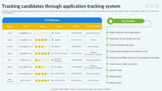 This slide showcases illustration of application tracking system ATS software which HRs can refer to influence their adoption decision. It provides details about email, rating, status, mobile, current position, quality of hire, cost per hire, bounce rates, etc. Create an editable Tracking Candidates Through Application Enhancing Recruitment Process PPT PowerPoint that communicates your idea and engages your audience. Whether you are presenting a business or an educational presentation, pre-designed presentation templates help save time. Tracking Candidates Through Application Enhancing Recruitment Process PPT PowerPoint is highly customizable and very easy to edit, covering many different styles from creative to business presentations. Slidegeeks has creative team members who have crafted amazing templates. So, go and get them without any delay. This slide showcases illustration of application tracking system ATS software which HRs can refer to influence their adoption decision. It provides details about email, rating, status, mobile, current position, quality of hire, cost per hire, bounce rates, etc.