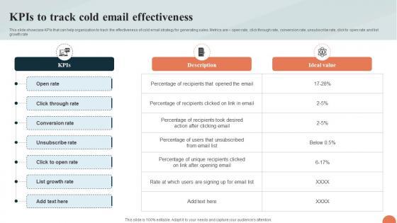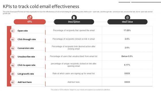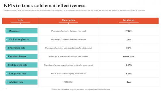 This slide showcase KPIs that can help organization to track the effectiveness of cold email strategy for generating sales. Metrics are open rate, click through rate, conversion rate, unsubscribe rate, click to open rate and list growth rate. The best PPT templates are a great way to save time, energy, and resources. Slidegeeks have 100 percent editable powerpoint slides making them incredibly versatile. With these quality presentation templates, you can create a captivating and memorable presentation by combining visually appealing slides and effectively communicating your message. Download KPIs To Track Cold Email Effectiveness Inside Vs Outside Sales PPT Template Strategy SS V from Slidegeeks and deliver a wonderful presentation. This slide showcase KPIs that can help organization to track the effectiveness of cold email strategy for generating sales. Metrics are open rate, click through rate, conversion rate, unsubscribe rate, click to open rate and list growth rate